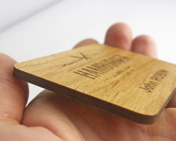 Su logo y los datos de sus empleados se graban en madera sostenible, lo que convierte la identificación en una opción libre de plástico que no requiere impresión.